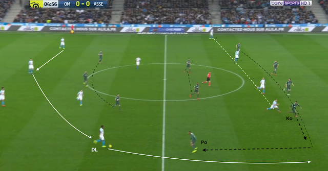 Ceci a été la première réponse tactique du staff marseillais pour contrer les Stéphanois mais pas la plus importante comme nous le verrons dans les exemples suivants.