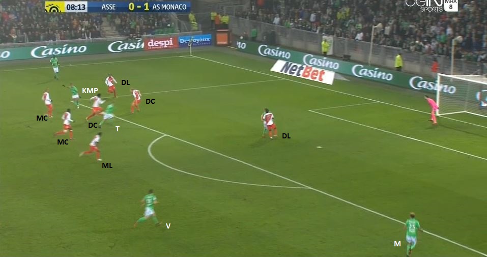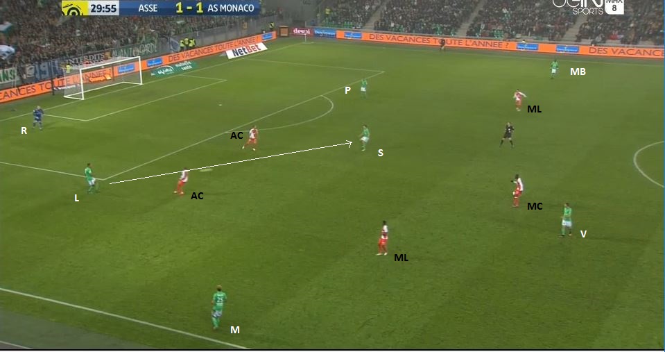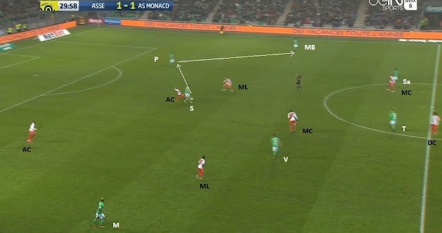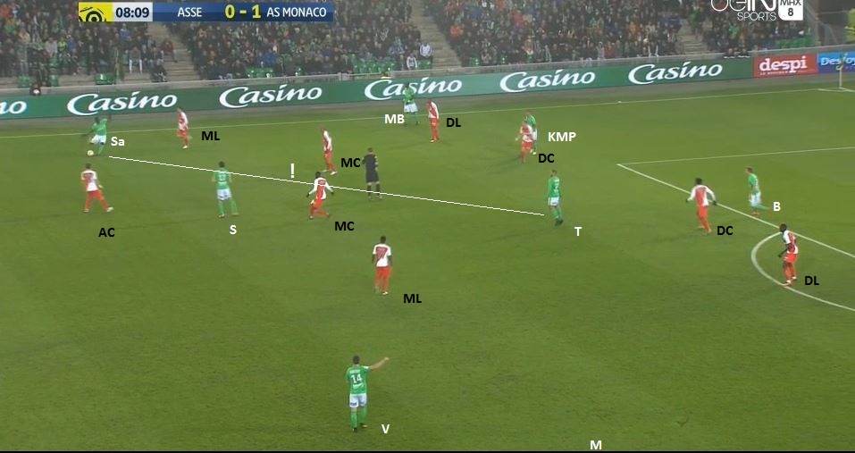 Comme les Monégasques défendent avec deux lignes de 4, sans sentinelle, il y a un espace entre les lignes. Les Verts jouent sans un "10" traditionnel, mais il était dommage de ne pas profiter de cet espace. Si en seconde période c'est Saivet qui l'a plutôt occupé (notre équipe ressemblant plus à un 4-2-3-1), en première mi-temps c'est notre faux milieu excentré Tannane qui l'a fait, comme dans cet exemple pris à la 8ème.
