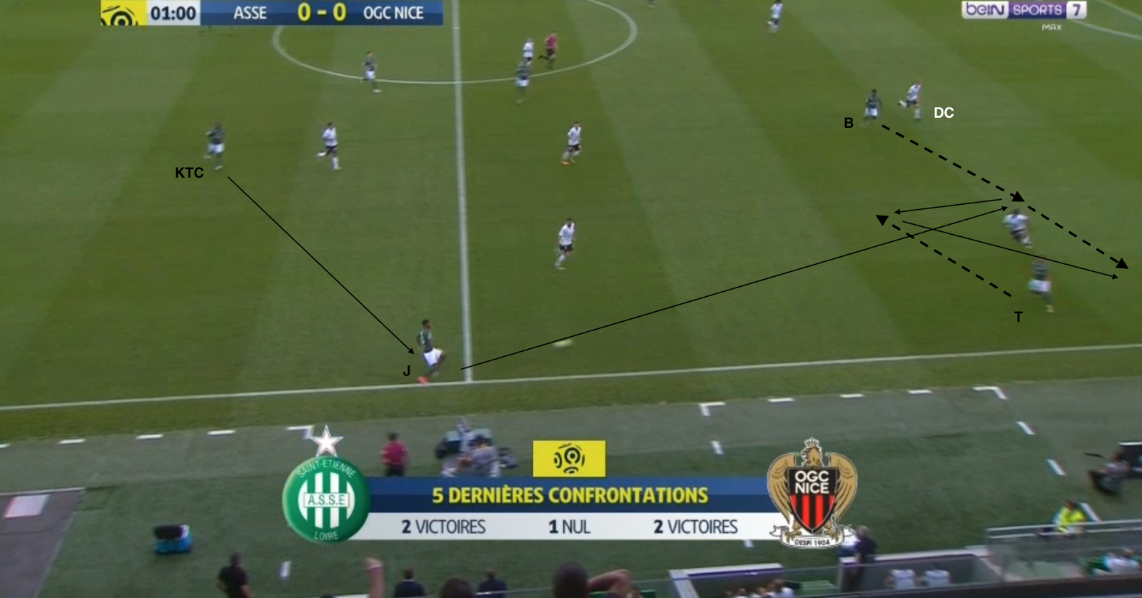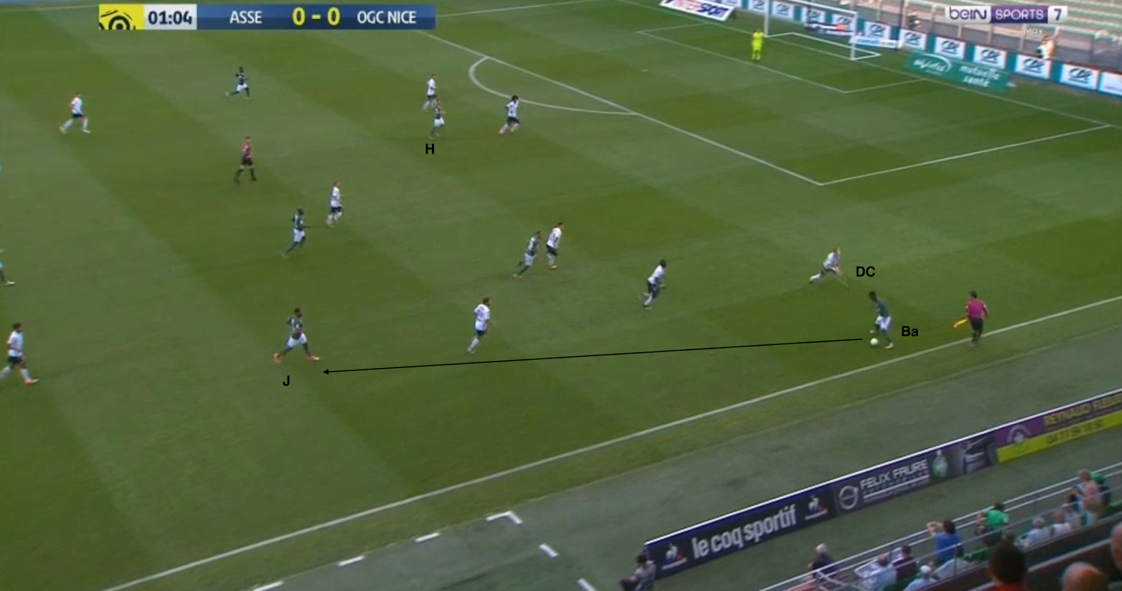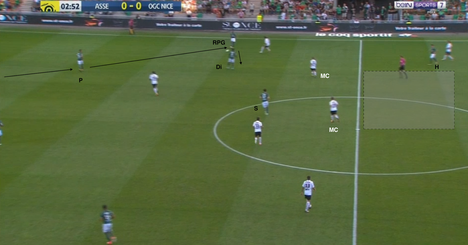 On remarque sur l'image ci-dessus le triangle pointe-basse des Verts, avec Dioussé et Dabo dans la ligne des milieux adverses, dans la moitié niçoise. Sous le pressing adverse, le ballon est envoyé jusqu'à Ruffier, qui relance avec Perrin et RPG de l'autre côté :