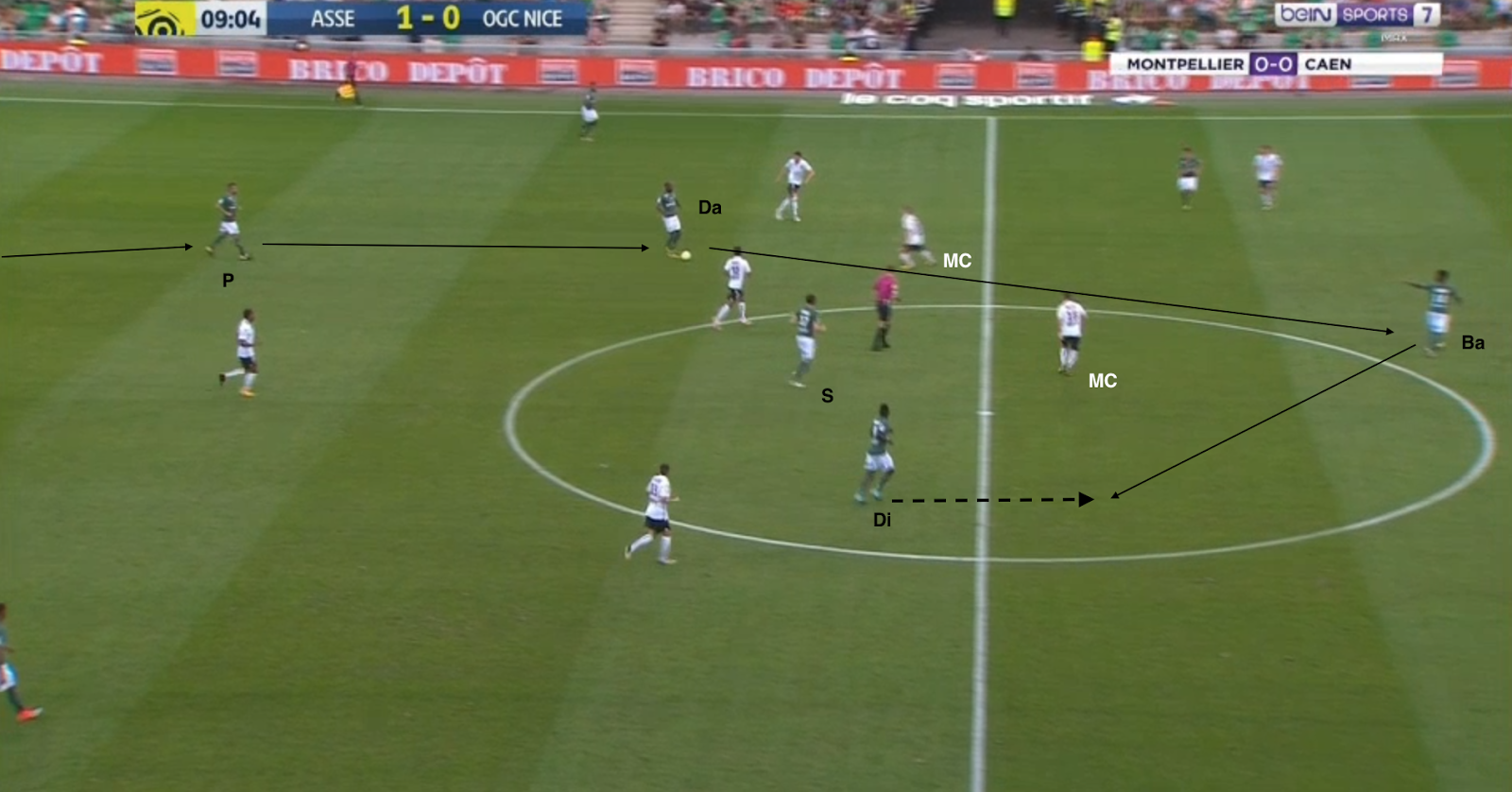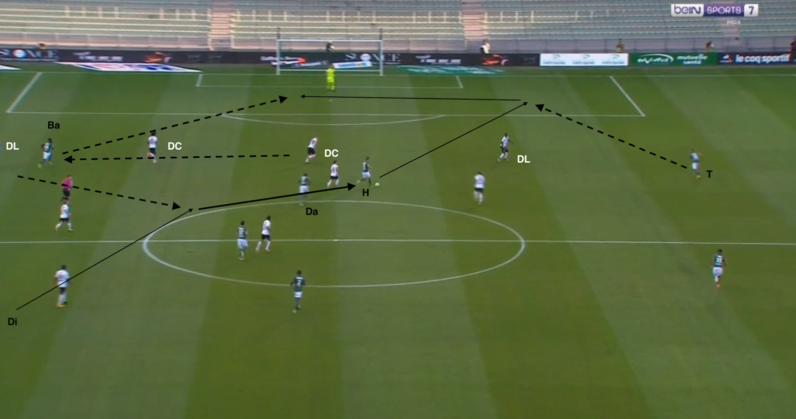 Comme Hamouma part de son côté vers l'axe (dans l'espace libéré), Bamba décroche sur ce côté, obligeant ainsi la défense à coulisser... et laisser la place à droite pour Tannane. Par contre, dès que Hamouma a pu profiter des espaces entre les défenseurs pour lancer Tannane, Bamba repique dans l'axe et se retrouve à la réception de la passe pour l'ouverture du score.