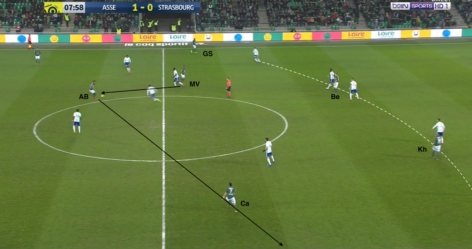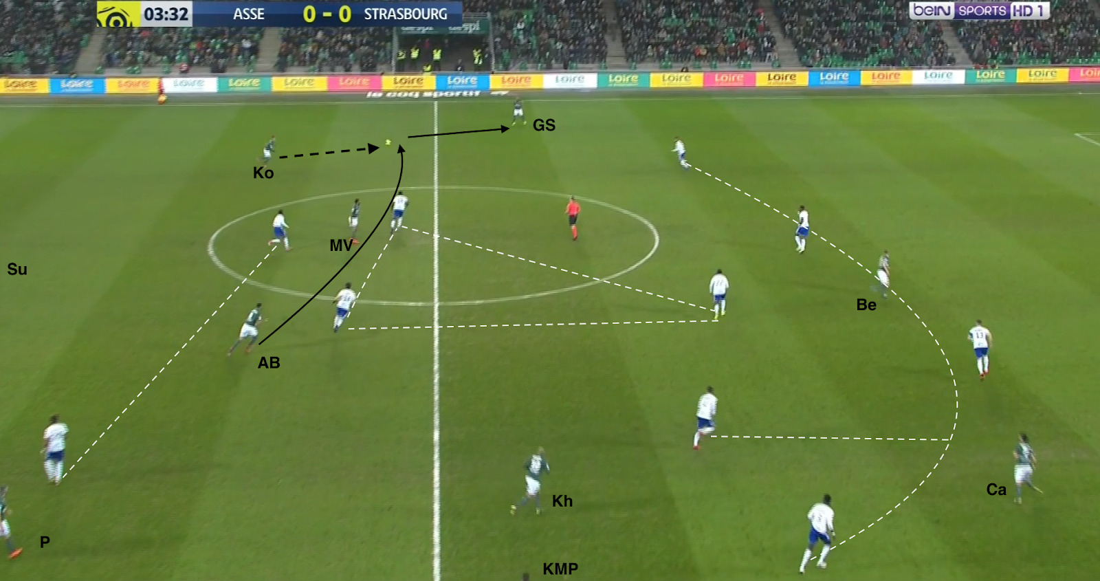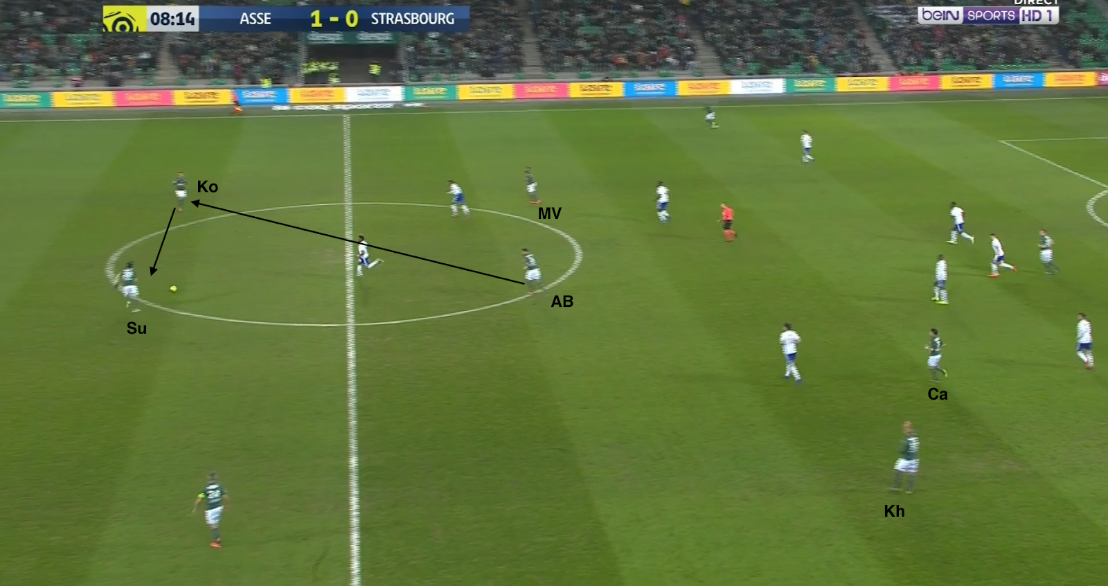 Les défenseurs de l'ASSE se passent le ballon, de Kolo vers Perrin via Subotic. Les pistons dans les couloirs, M'Vila et Aït Bennasser au centre, Cabella, Beric et Khazri dans la défense. Le dernier décroche pour offrir une solution de passe au capitaine mais celui-ci préfère un long ballon en profondeur à destination de Beric. Un défenseur adverse le récupère facilement...