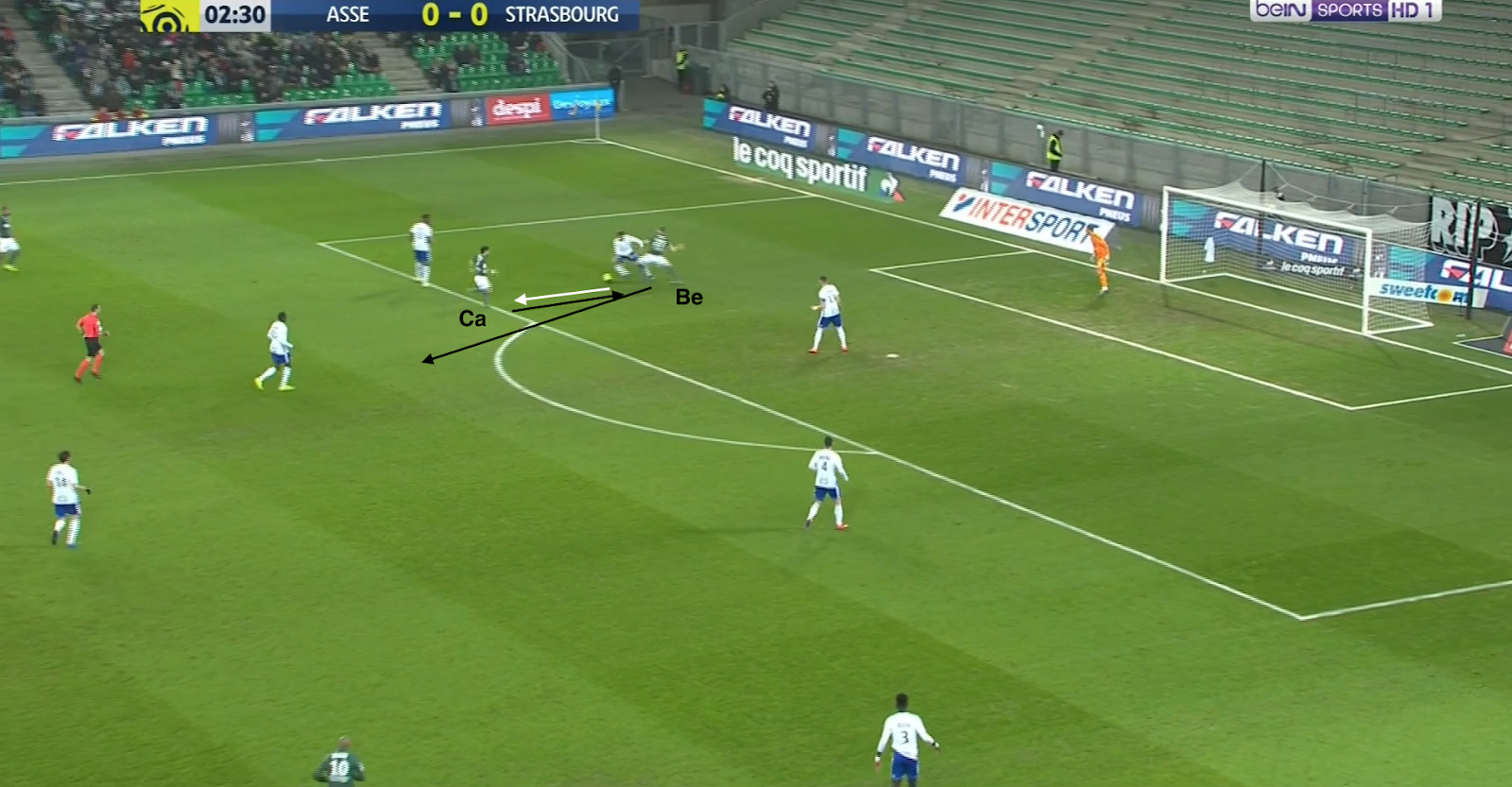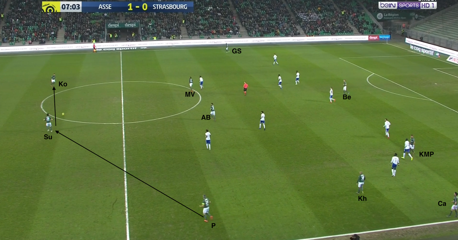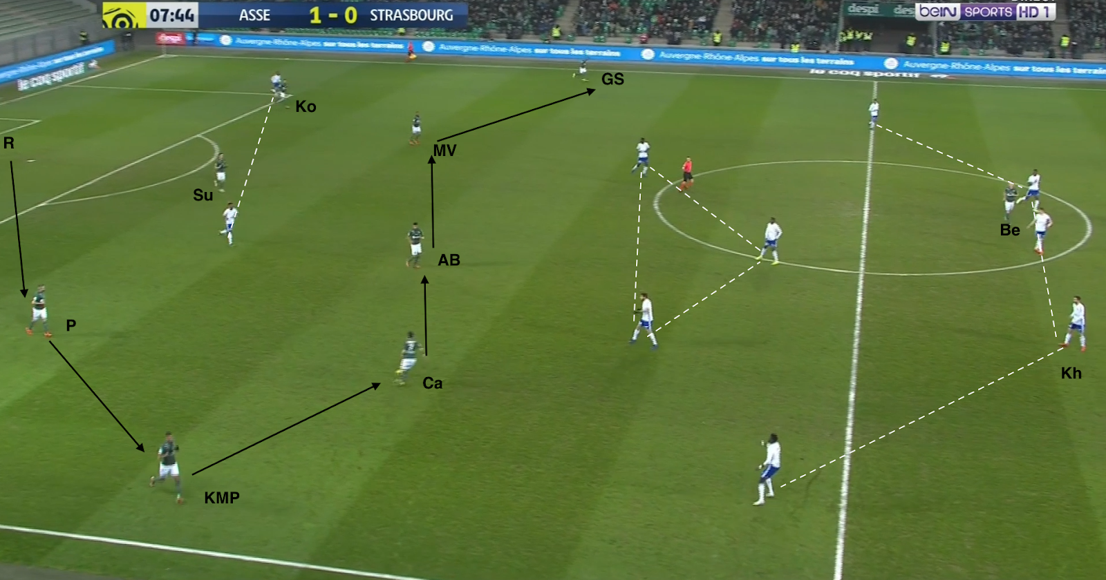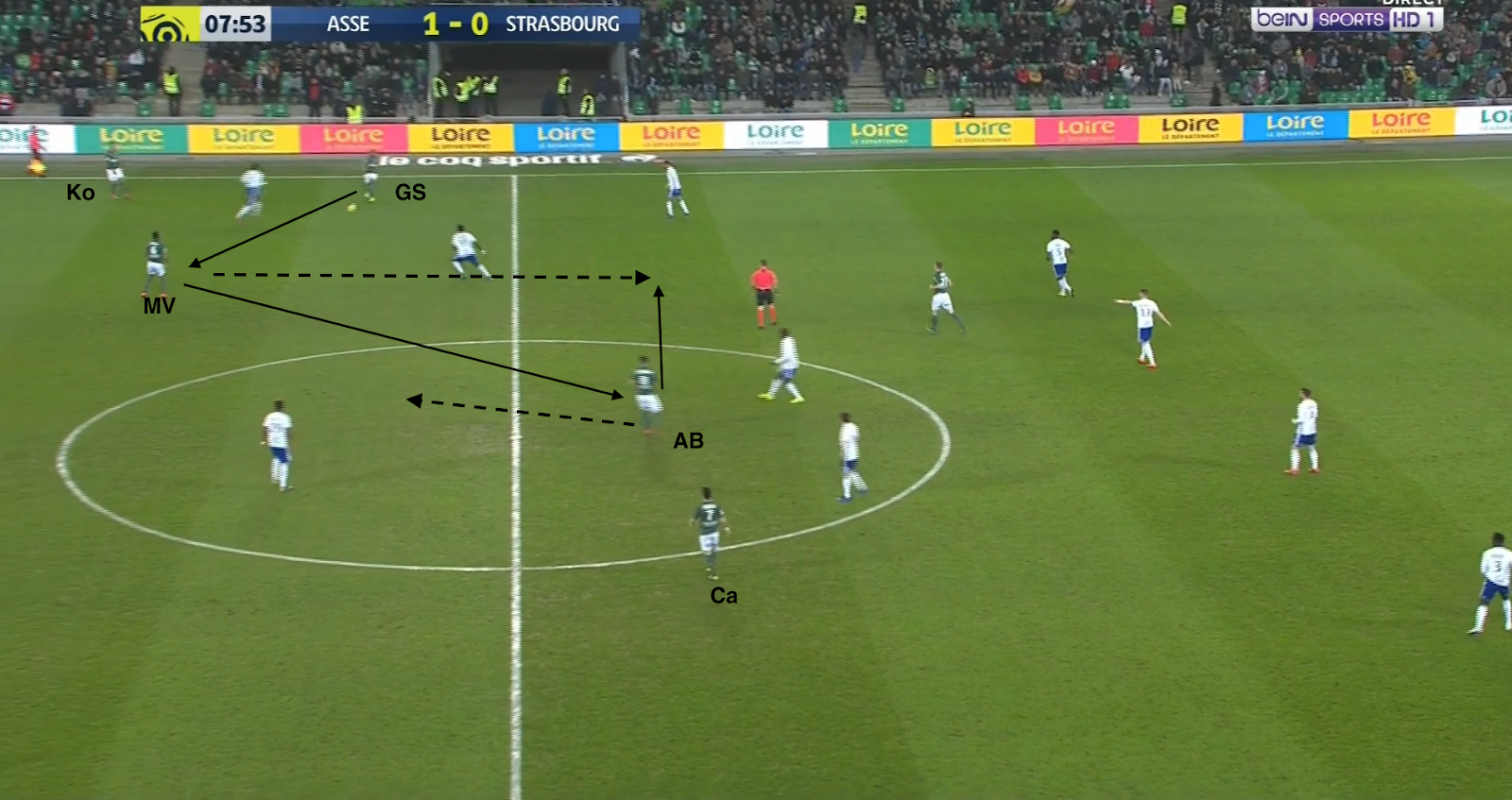 Les défenseurs de l'ASSE se passent le ballon, de Kolo vers Perrin via Subotic. Les pistons dans les couloirs, M'Vila et Aït Bennasser au centre, Cabella, Beric et Khazri dans la défense. Le dernier décroche pour offrir une solution de passe au capitaine mais celui-ci préfère un long ballon en profondeur à destination de Beric. Un défenseur adverse le récupère facilement...