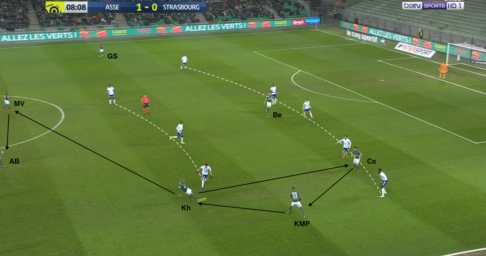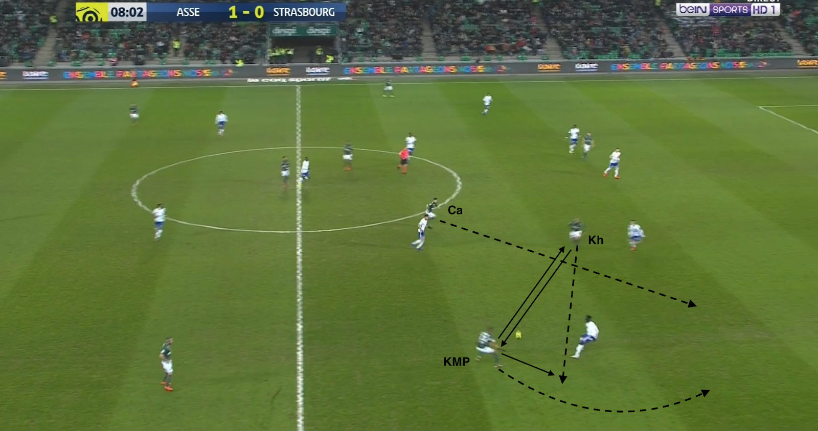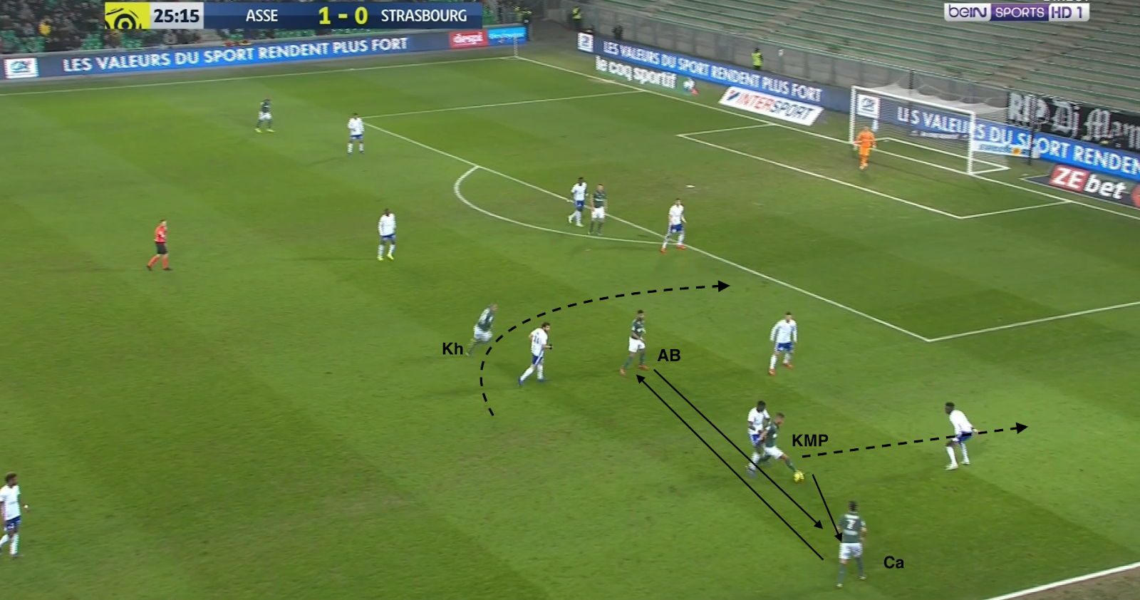 ... ce qui déclenche le mouvement des deux milieux axiaux stéphanois vers ce côté. Un seul milieu adverse a suivi, les deux autres restant l'un à côté de l'autre dans l'axe, et ne servant en fait à rien. A 4 contre 3 sur ce côté, les Verts combinent : Khazri redonne à KMP et repique vers l'axe...