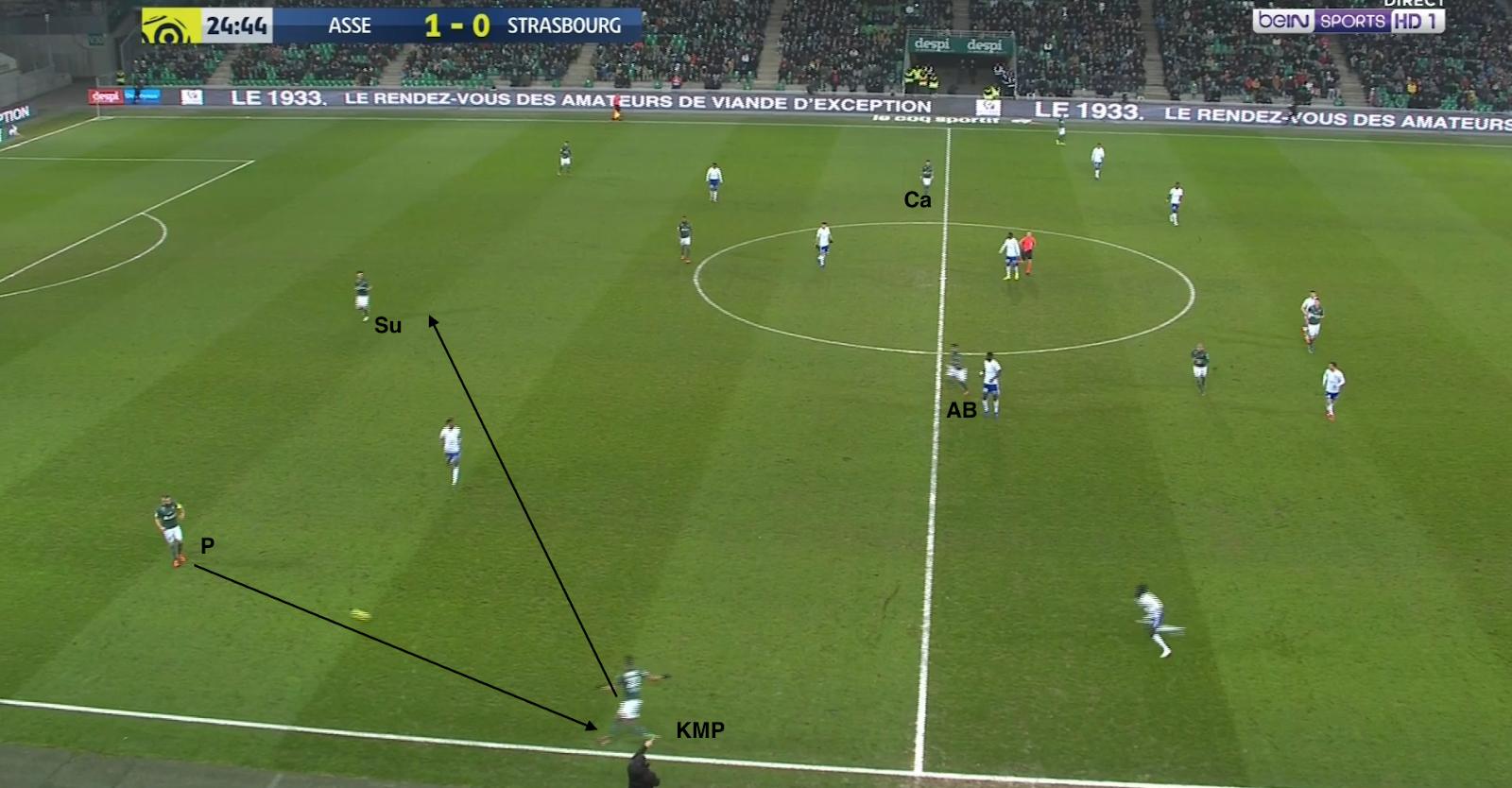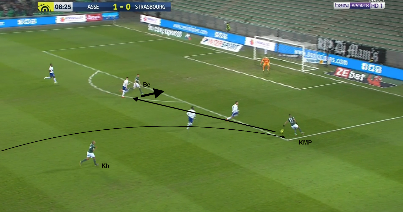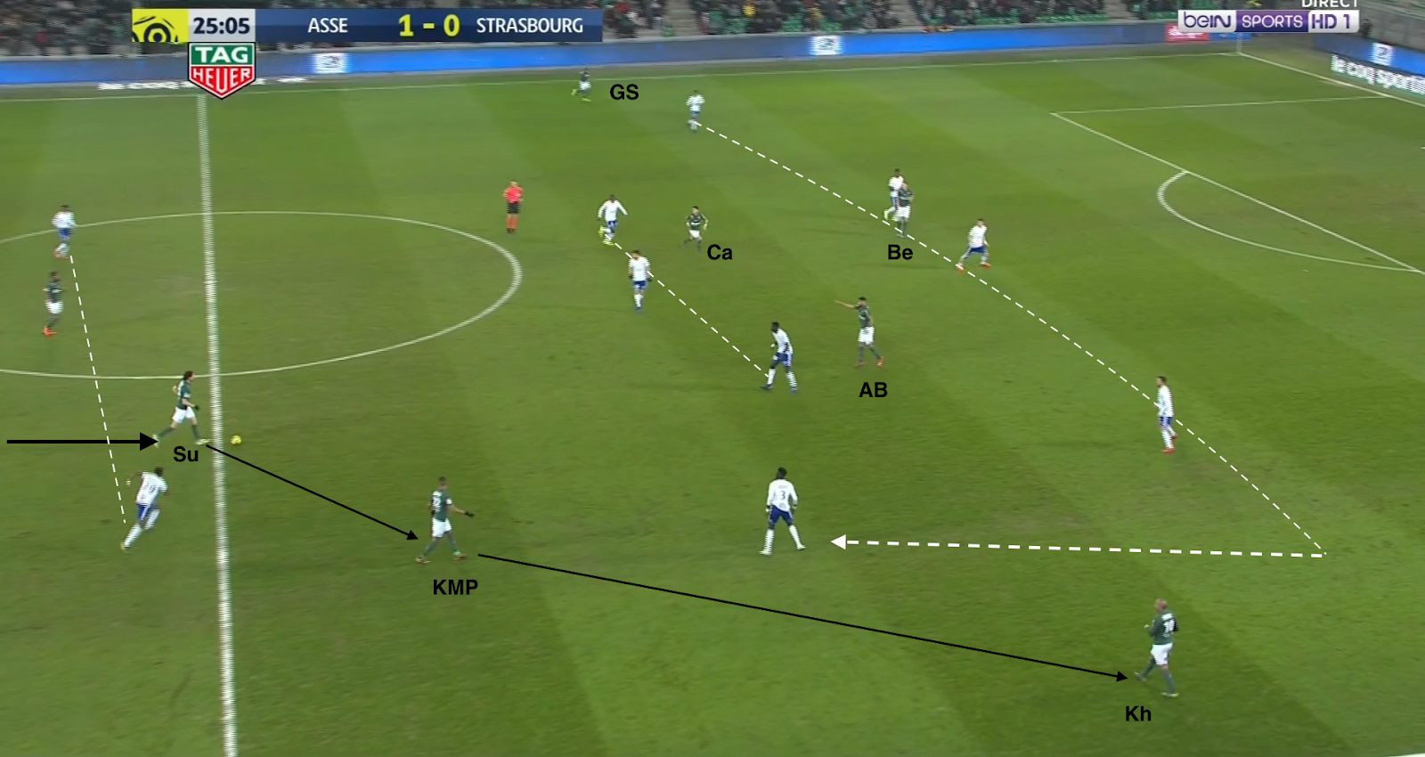 ... ce qui déclenche le mouvement des deux milieux axiaux stéphanois vers ce côté. Un seul milieu adverse a suivi, les deux autres restant l'un à côté de l'autre dans l'axe, et ne servant en fait à rien. A 4 contre 3 sur ce côté, les Verts combinent : Khazri redonne à KMP et repique vers l'axe...