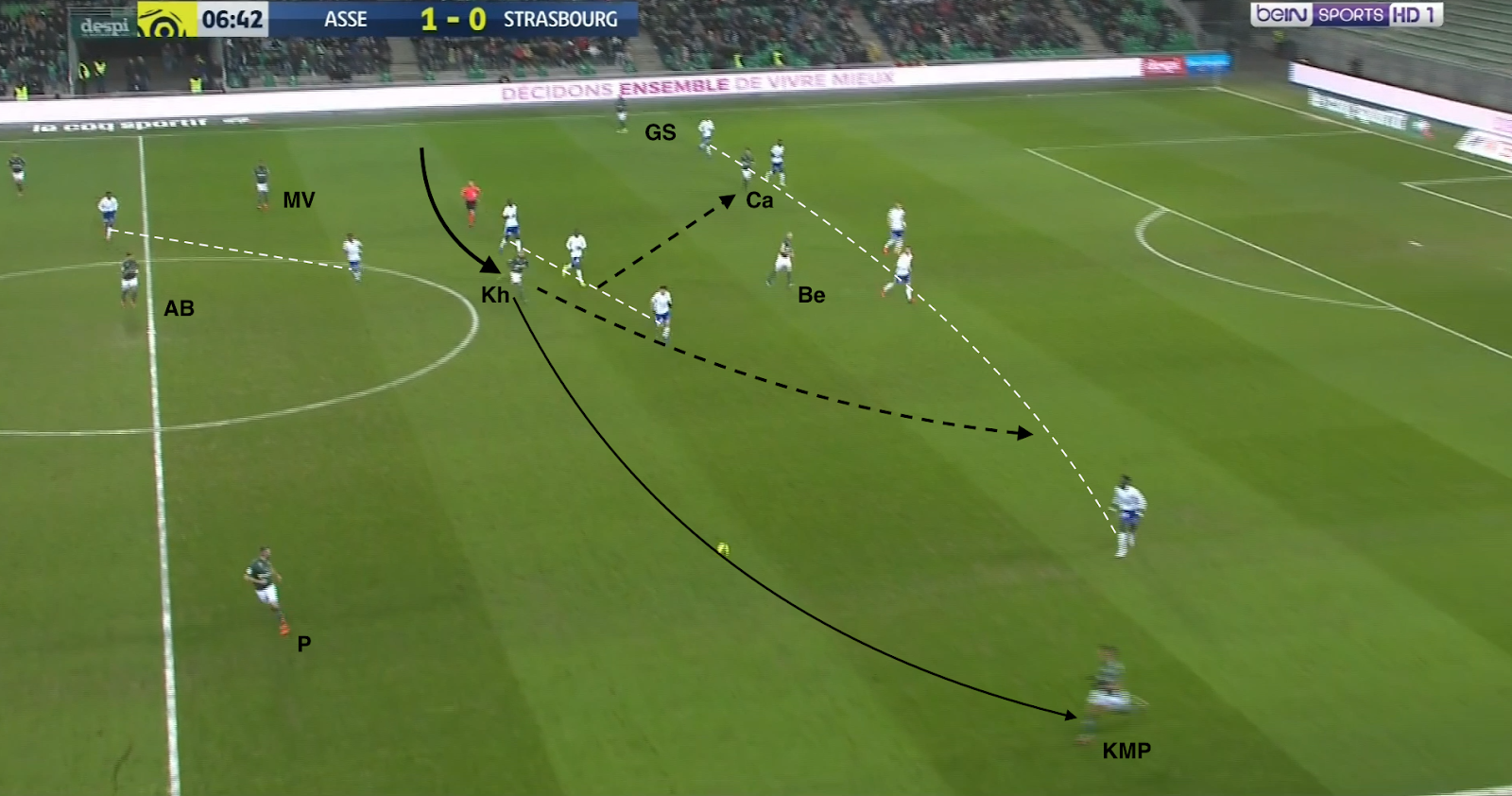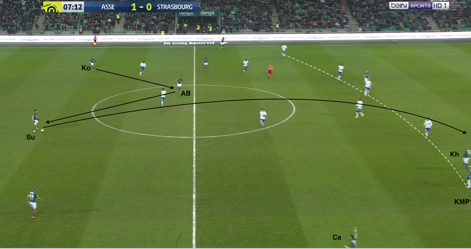 ... et ils combinent ensuite avec M'Vila et Aït Bennasser. Le triangle des milieux adverses est toujours en place mais il n'y a toujours aucun stéphanois dans l'axe entre les lignes : Khazri est à côté de Gabriel Silva et Cabella vers KMP. Le premier décroche, comme dans l'exemple précédent, et il est servi par Kolo :