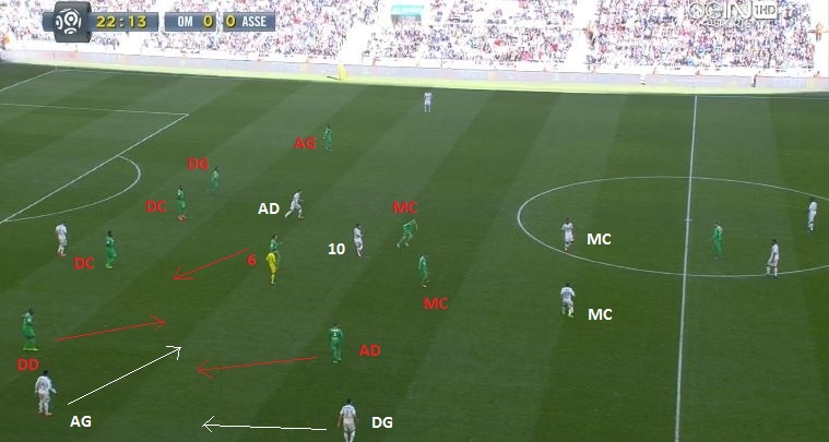 Une superbe attaque préparée par l'OM, le tout parti avec des appels vers l'intérieur faits par les ailiers marseillais, réponse correcte du bloc stéphanois qui se positionne pour combler les trous, repositionnement standard des ailiers marseillais et... repositionnement lent du bloc vert qui n'arrive pas à coulisser assez vite. A noter également que pendant tout ce temps, Sall n'a jamais eu d'adversaire, il n'a jamais pris le "9" marseillais pour libérer Pogba qui aurait pu libérer Assou-Ekotto qui aurait pu combler le sous-nombre. Autrement dit, le surnombre en défense centrale, censé aider dans ce genre de situations, n'a jamais été utilisé...