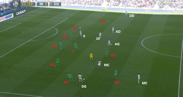 Prenons un exemple dans le dernier match des Verts, à Marseille. Sur cette capture d'écran on peut bien voir le bloc stéphanois en 4-1-4-1, presque parfaitement aligné, sauf KTC (DD) qui monte chercher leur ailier gauche Nkoudou (AG). Notre sentinelle, Selnaes ("6") et leur meneur, Cabella ("10") sont entre les lignes :