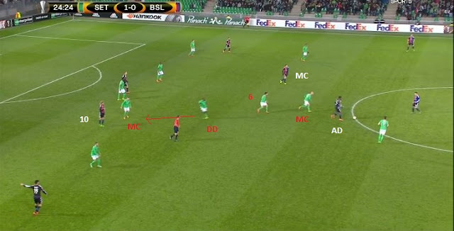 Voilà pour la théorie. Elle est importante parce que si on regarde les deux derniers matchs des Verts, on peut observer des similitudes. Tout d'abord, les deux adversaires utilisent le même système 4-2-3-1 et font preuve d'une meilleure maîtrise du ballon que l'ASSE (55.1% pour Bâle, 57% pour OM avant le carton rouge). Cette possession leur a permis de construire des attaques en appuyant toujours sur ce mouvement type. Un ailier pique vers le centre (Embolo pour Bâle, Thauvin et plus rarement Nkoudou pour OM), ce qui crée des mouvements. Et, malheureusement, assez souvent le bloc vert n'arrive pas à bien colmater les espaces créés par ces appels.