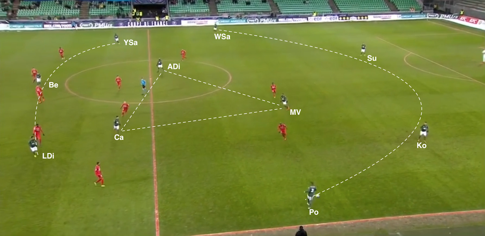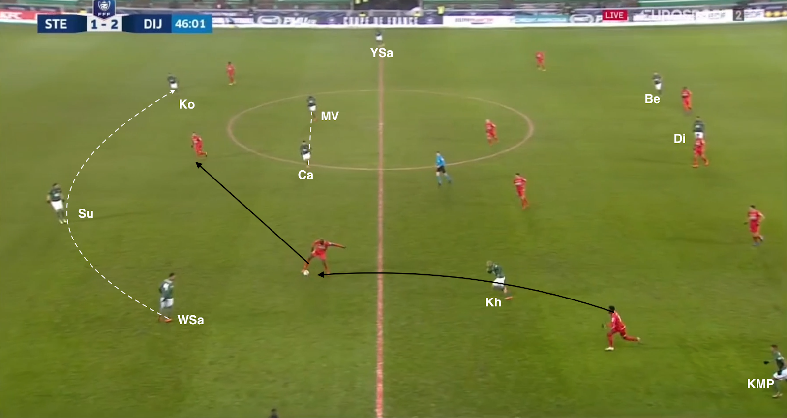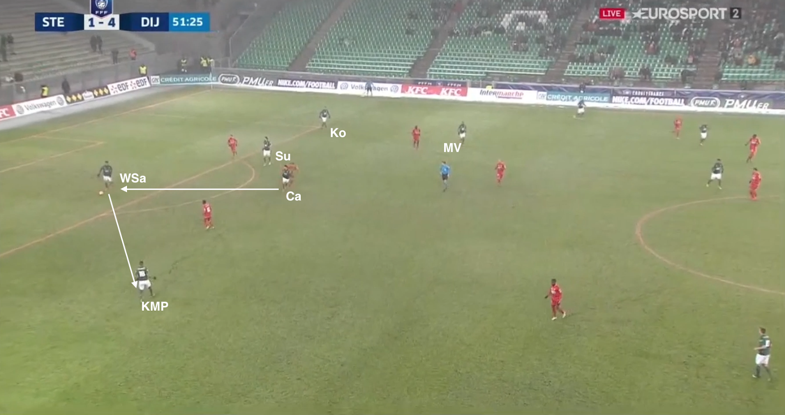 ... Cabella remet pour Saliba, qui lance KMP dans le couloir droit. L'audace et la maîtrise ont parlé, les Verts sont sortis proprement du pressing adverse. Mais pas pour longtemps, KMP a un peu de mal à contrôler le ballon et se fait de suite entouré par les adversaires :