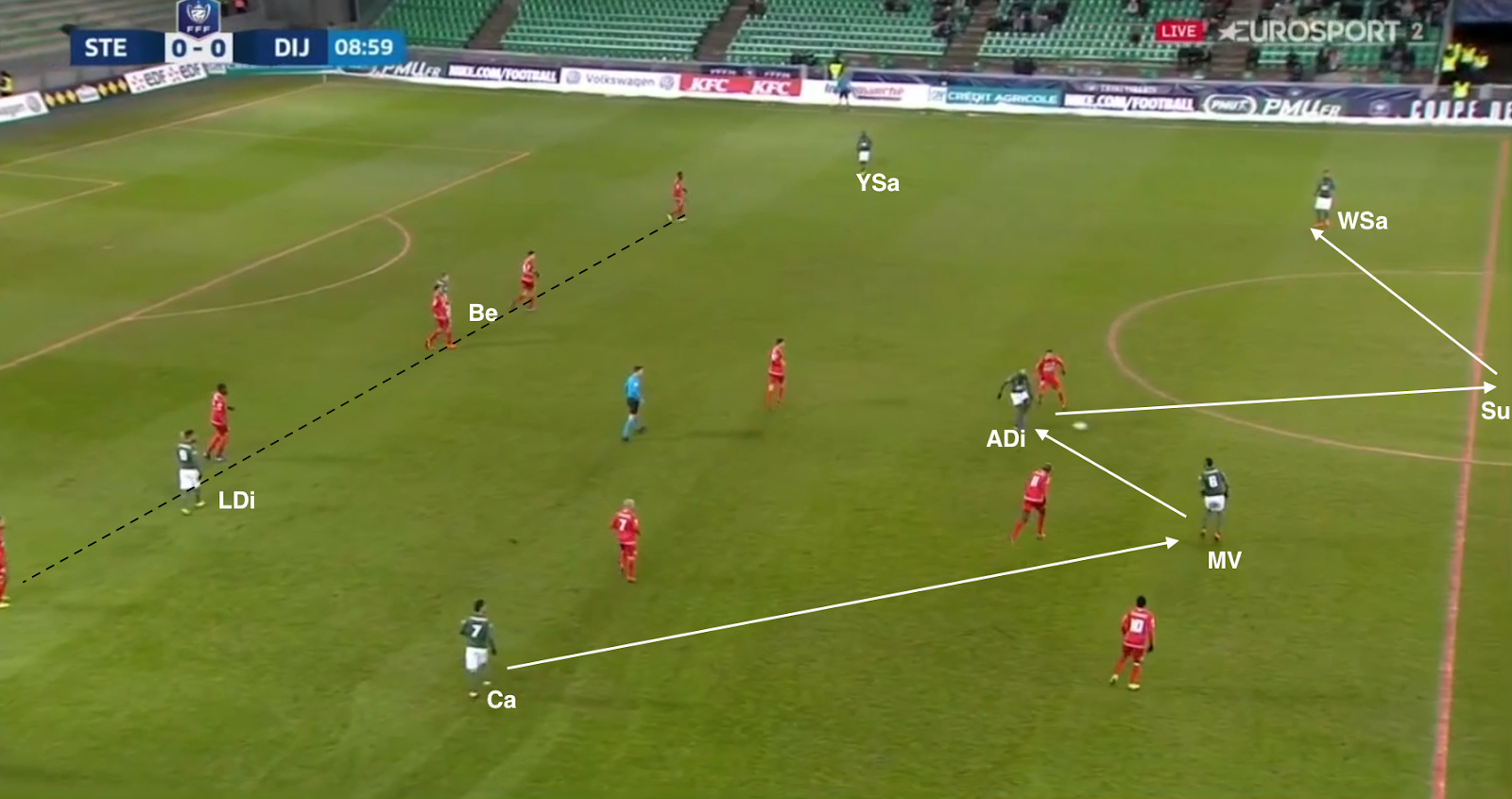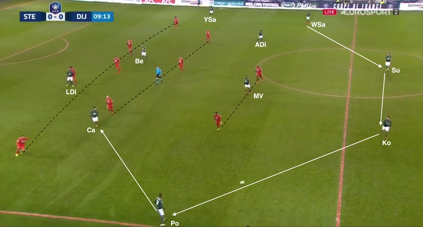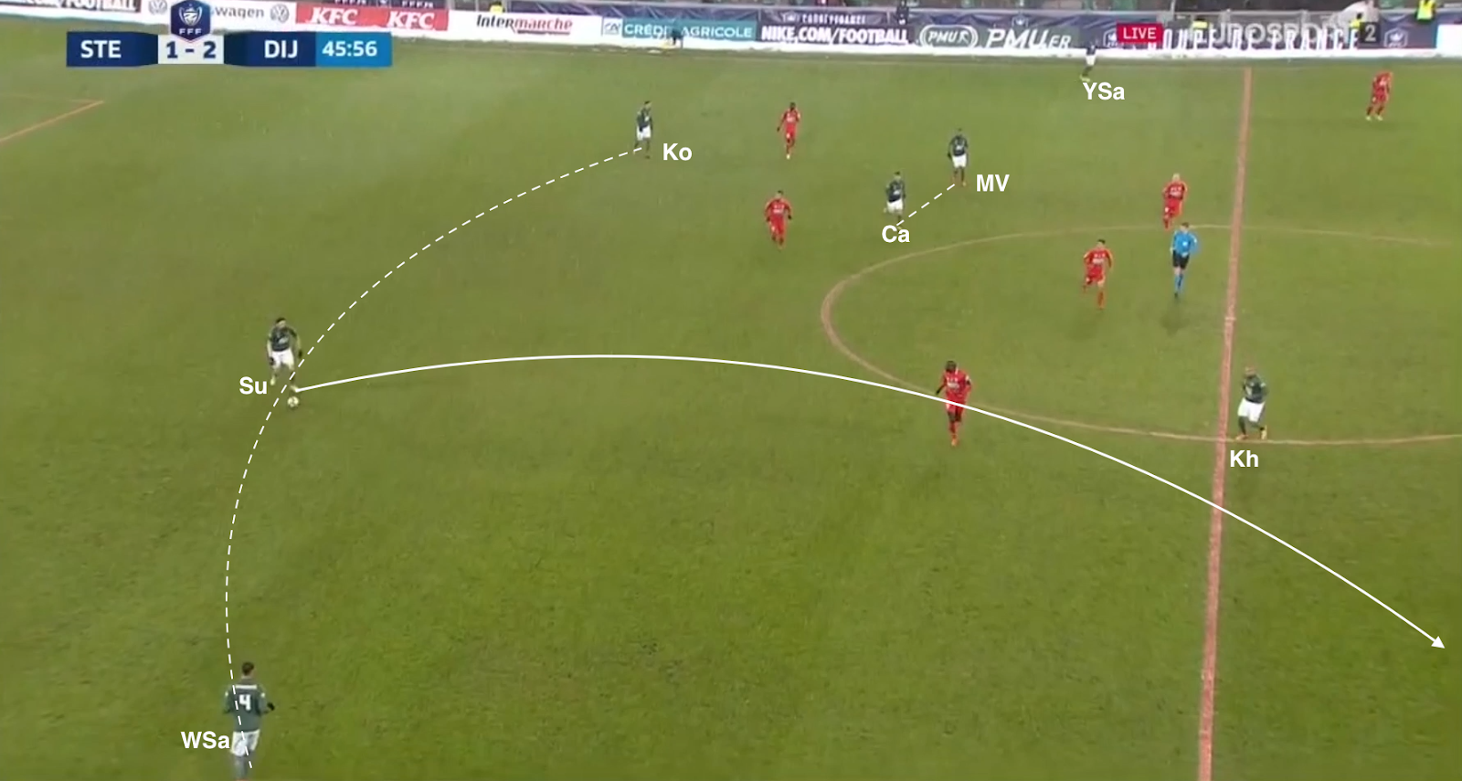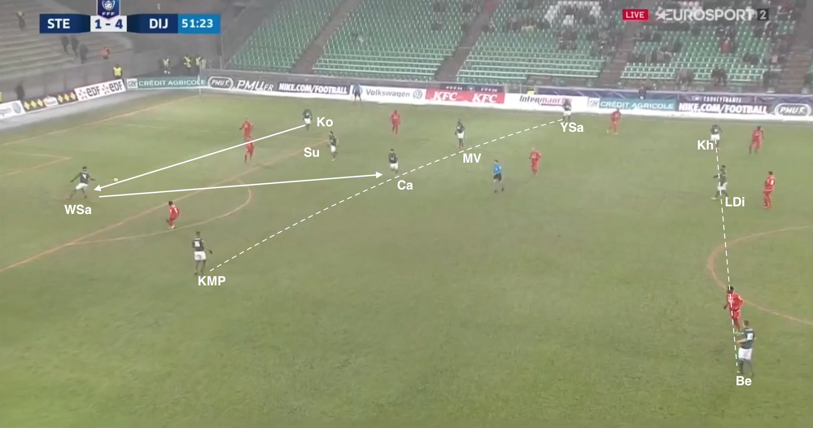 ... Cabella remet pour Saliba, qui lance KMP dans le couloir droit. L'audace et la maîtrise ont parlé, les Verts sont sortis proprement du pressing adverse. Mais pas pour longtemps, KMP a un peu de mal à contrôler le ballon et se fait de suite entouré par les adversaires :