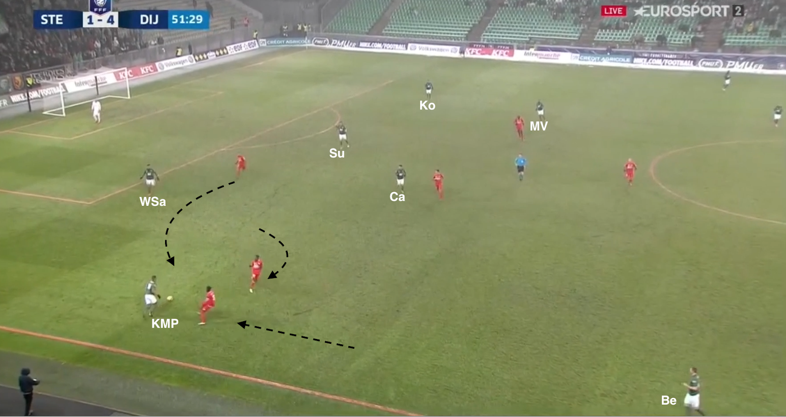 Un lui coupe la possibilité de passe vers Saliba, un autre vers Cabella et un 3e vers Beric. De plus, les deux milieux axiaux censés sortir le ballon sont surveillés de près. KMP finit par perdre le ballon et l'ASSE concède un 5e but, le 3e dans les 7 premières minutes de la 2MT.