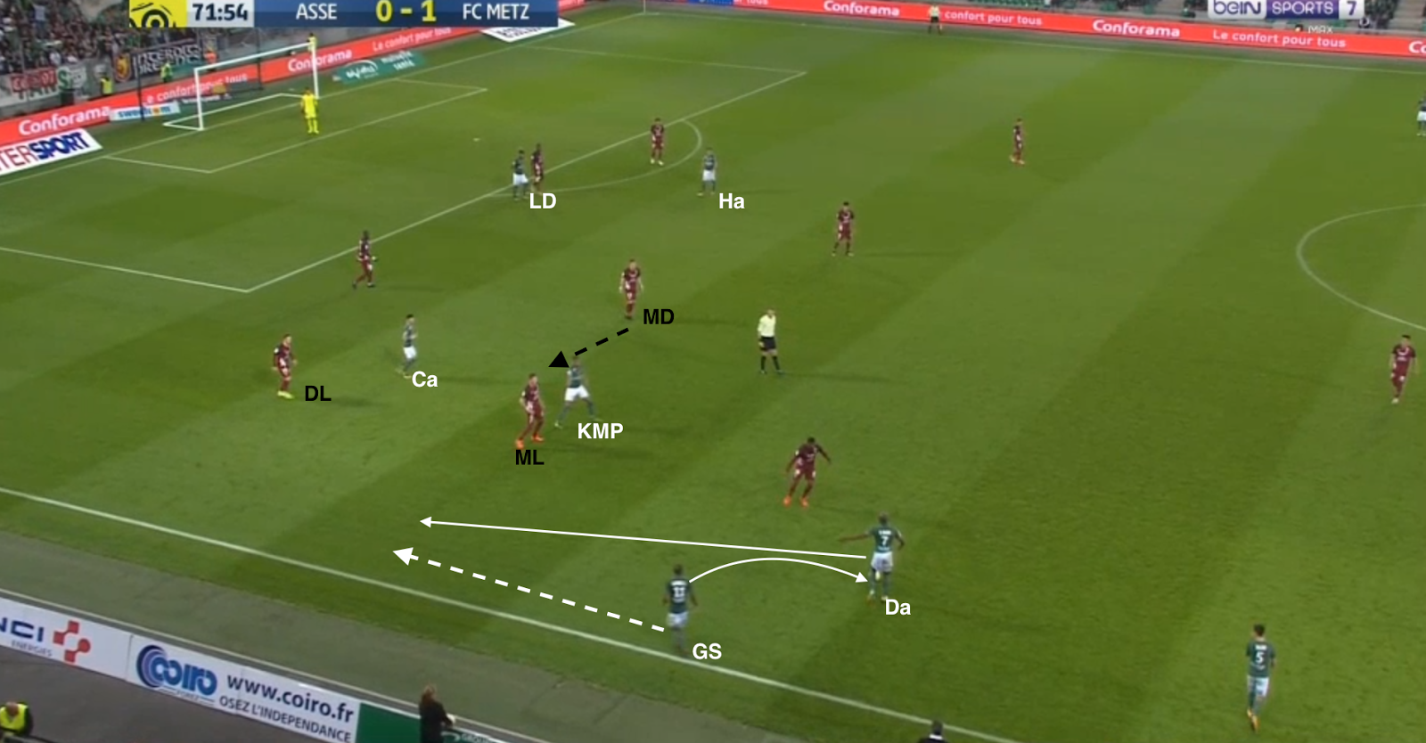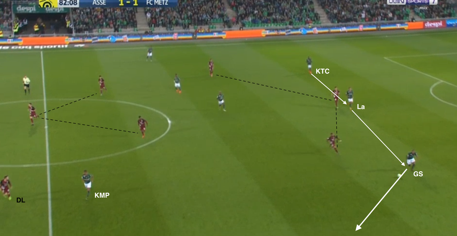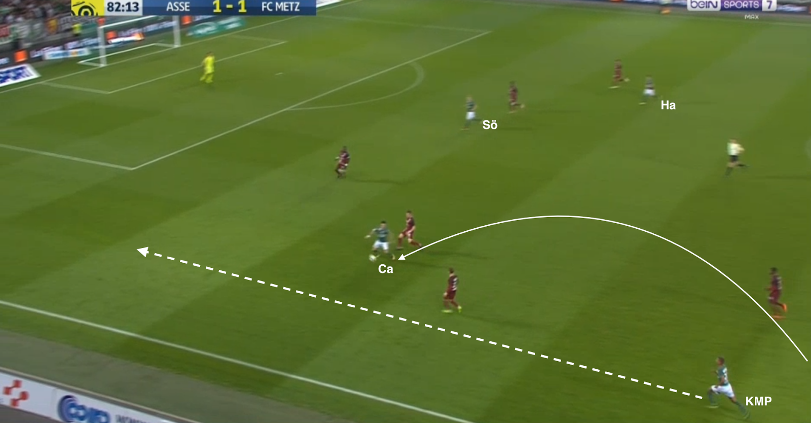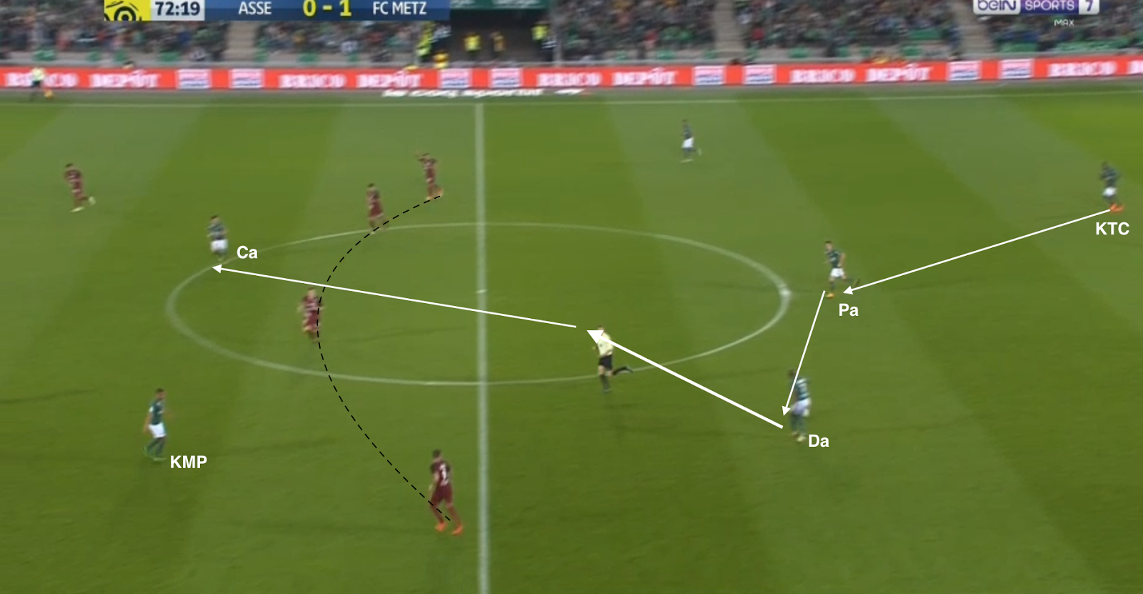 L'entrée de KMP à la place de Diousse et le passage d'un 4-3-3 à un 4-2-3-1 avec Cabella clairement positionné dans l'axe, ainsi que la sortie de Cohade chez les messins, accentue la possibilité pour les Verts de chercher un joueur entre les lignes, dans l'axe.