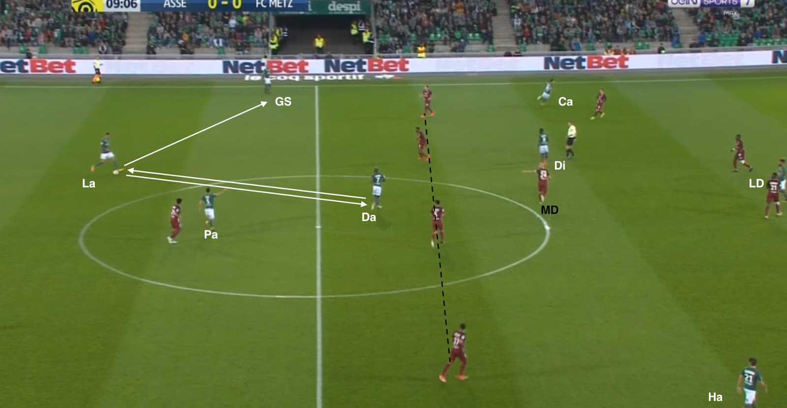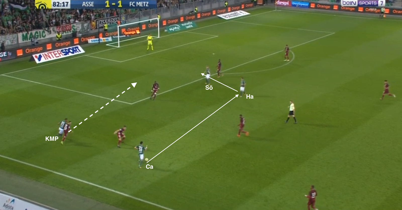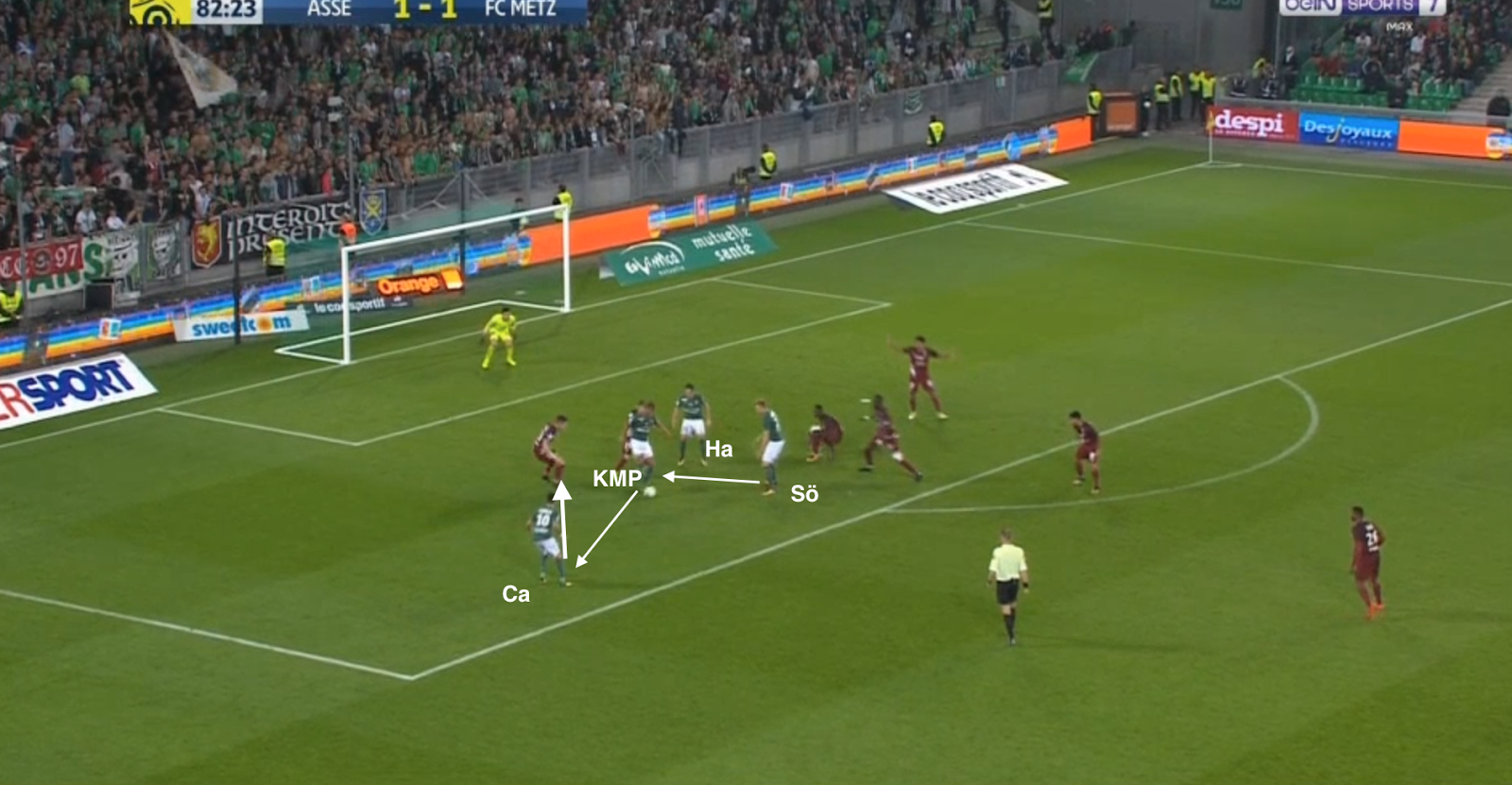 L'entrée de KMP à la place de Diousse et le passage d'un 4-3-3 à un 4-2-3-1 avec Cabella clairement positionné dans l'axe, ainsi que la sortie de Cohade chez les messins, accentue la possibilité pour les Verts de chercher un joueur entre les lignes, dans l'axe.