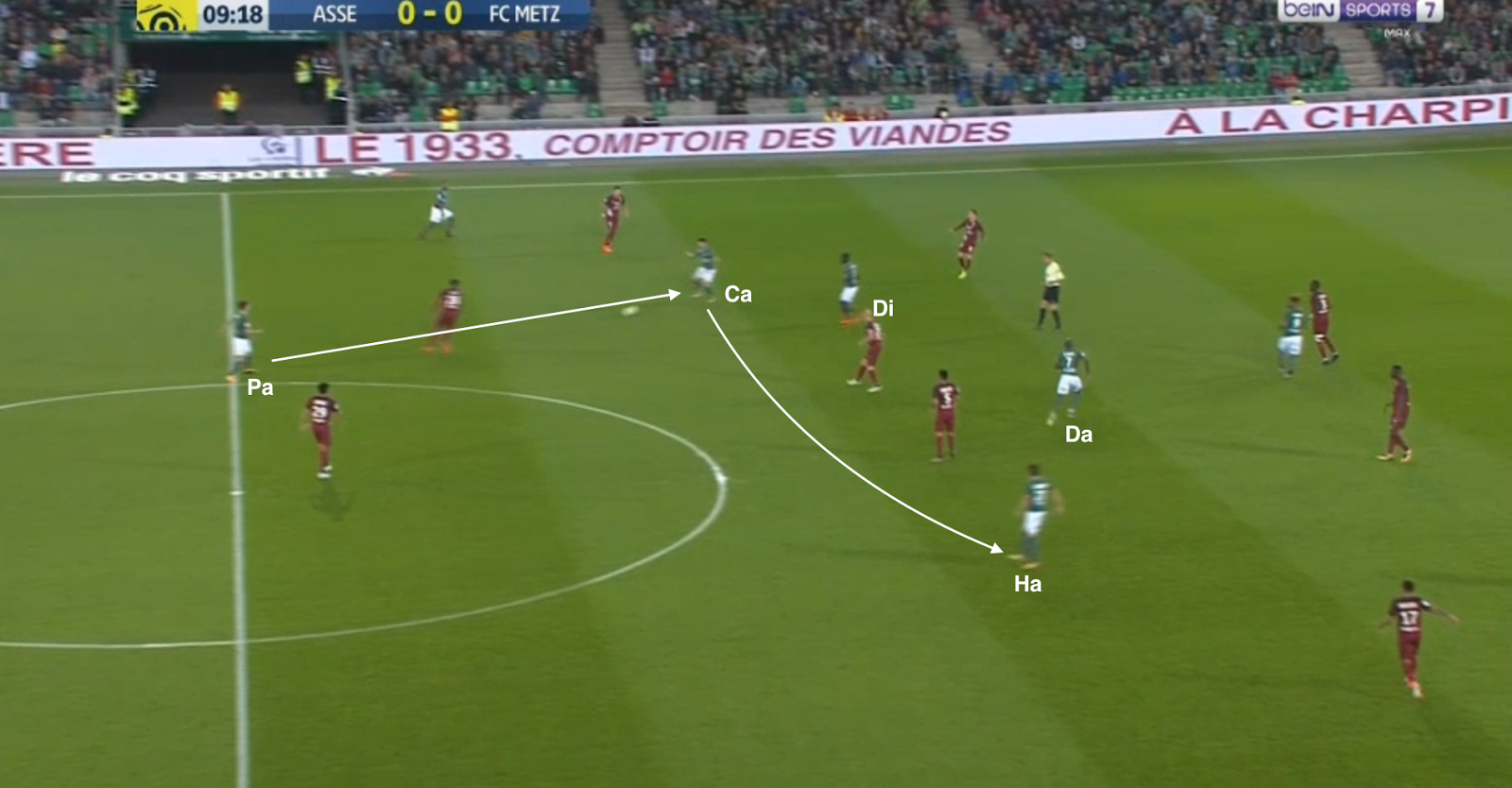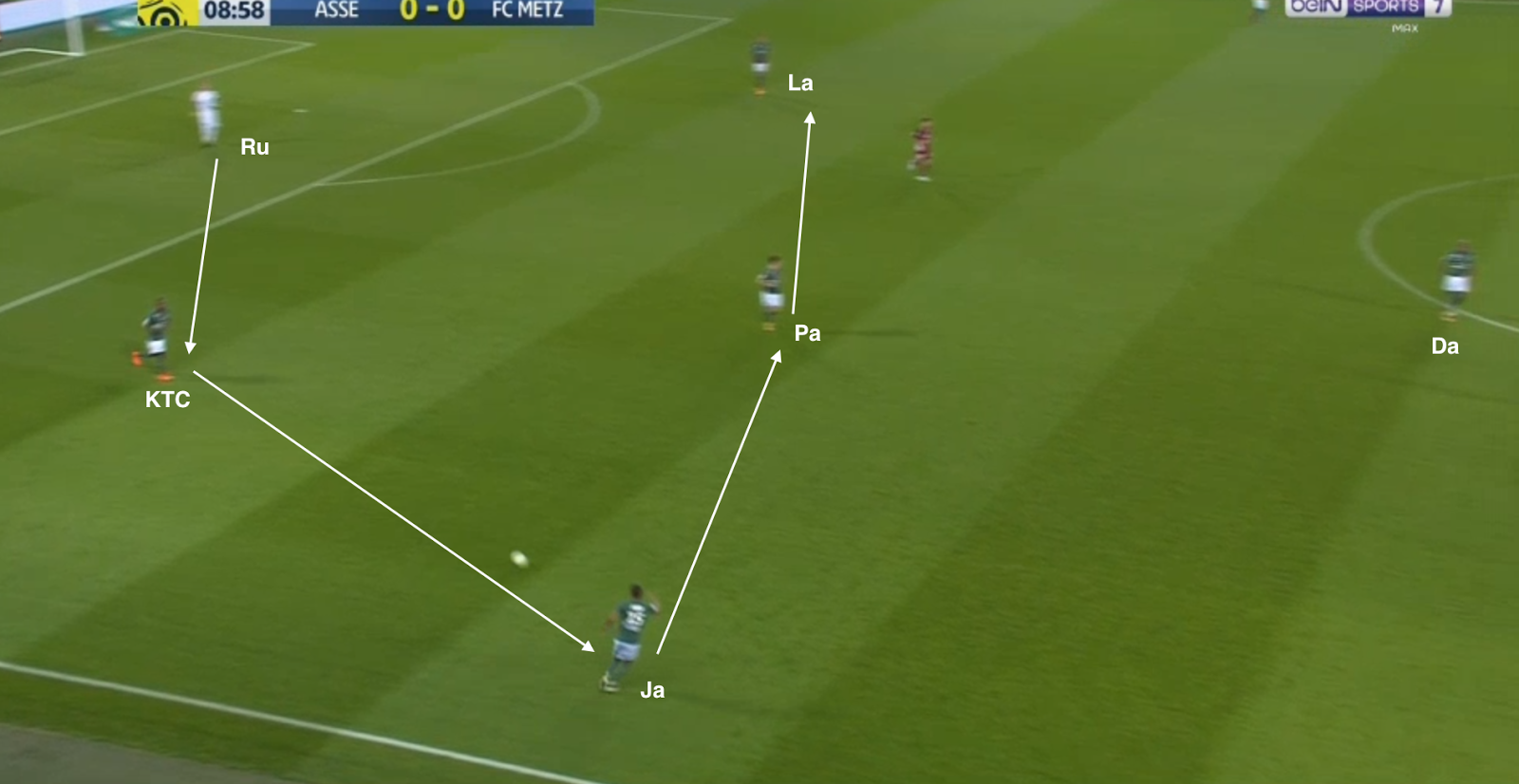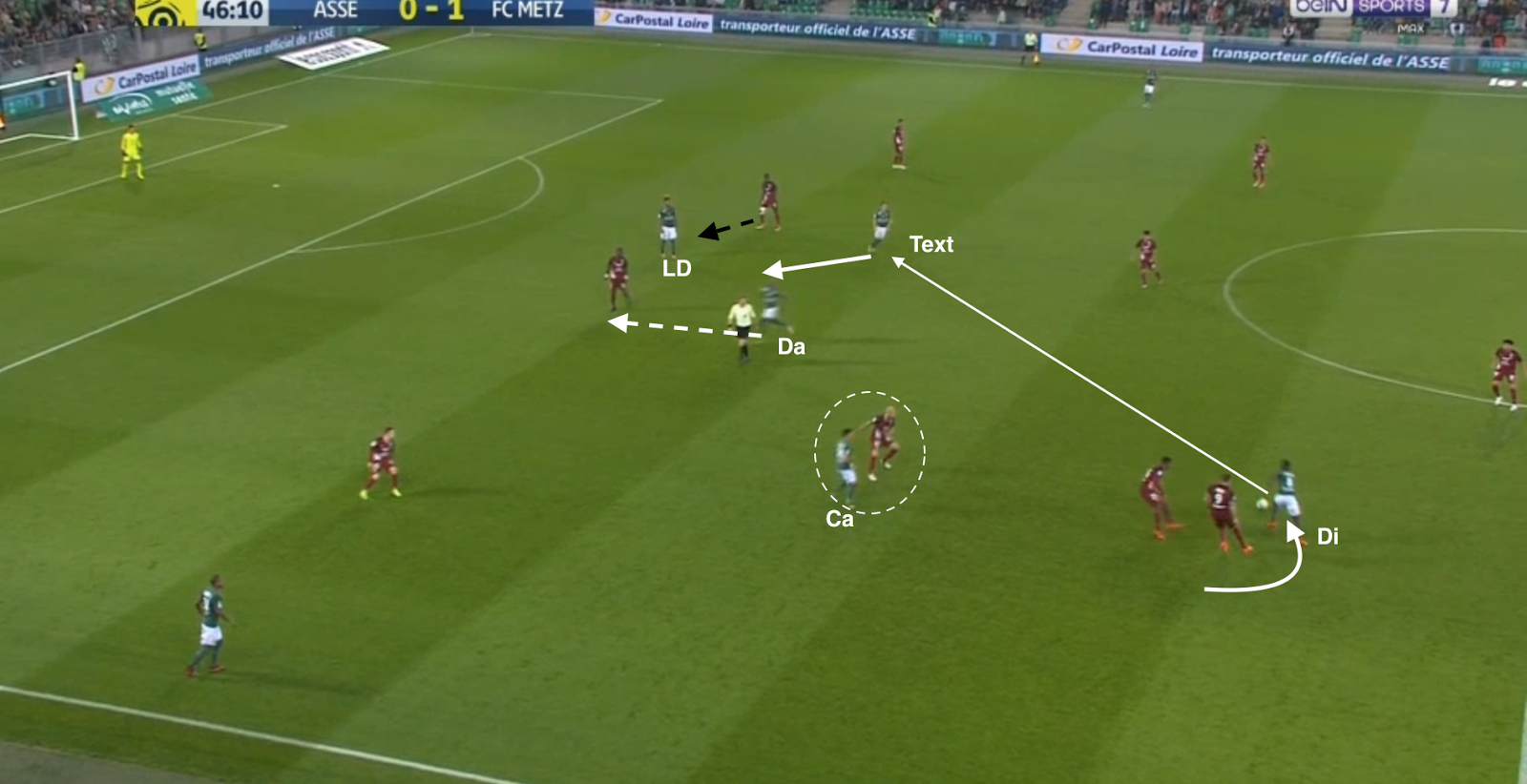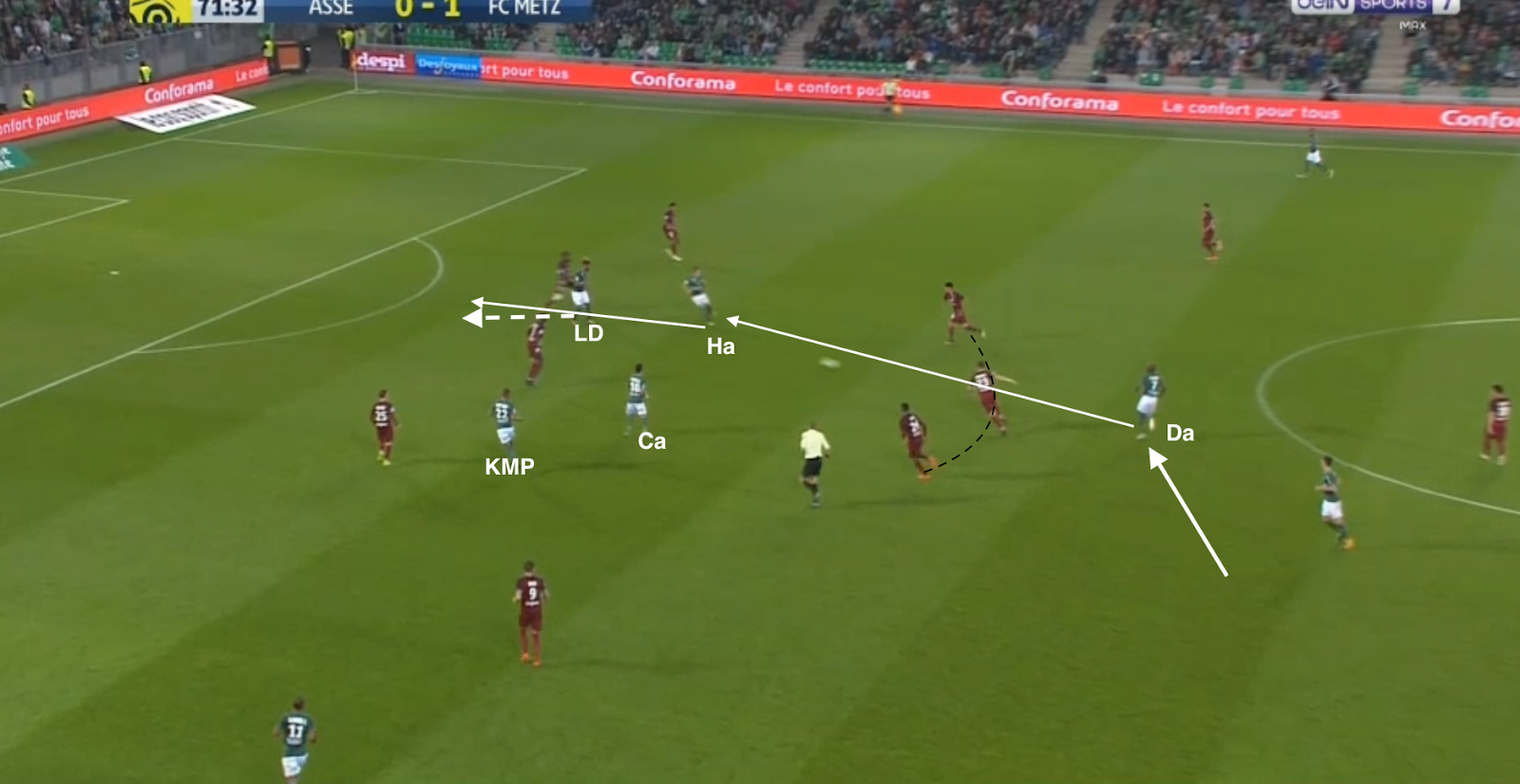 L'entrée de KMP à la place de Diousse et le passage d'un 4-3-3 à un 4-2-3-1 avec Cabella clairement positionné dans l'axe, ainsi que la sortie de Cohade chez les messins, accentue la possibilité pour les Verts de chercher un joueur entre les lignes, dans l'axe.