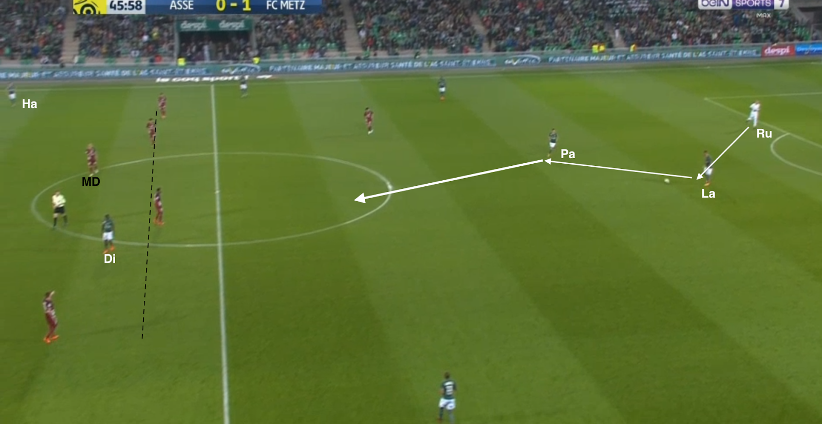 Cette action est une attaque-type stéphanoise en première période, avec plusieurs fois un décalage créé sur le côté droit et un centre qui ne donne rien, sauf le poteau de Cabella en début de match.