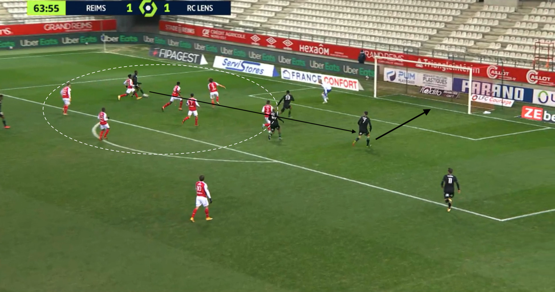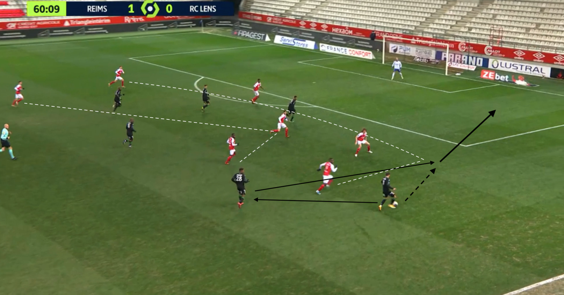 Bloc en 4-5-1 pour Reims et attaque plein centre pour Lens, qui profite que l'avant-centre adverse n'est pas revenu pour empêcher ce genre d'action. Malgré les deux lignes très resserrées, la maîtrise lensoise leur permet de combiner dans le bloc et de passer le premier rideau. Ce qui casse tout le système défensif, les Rémois se désorganisant complètement :