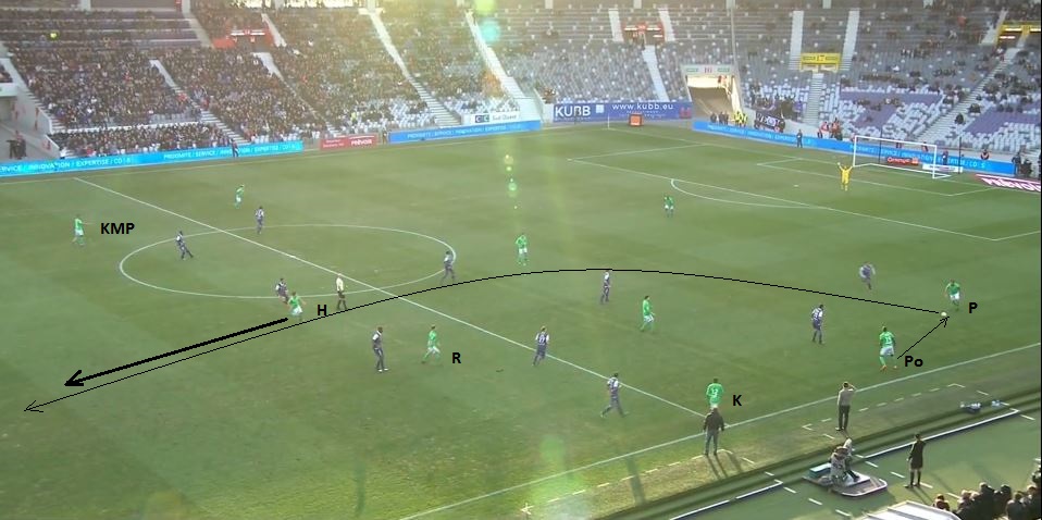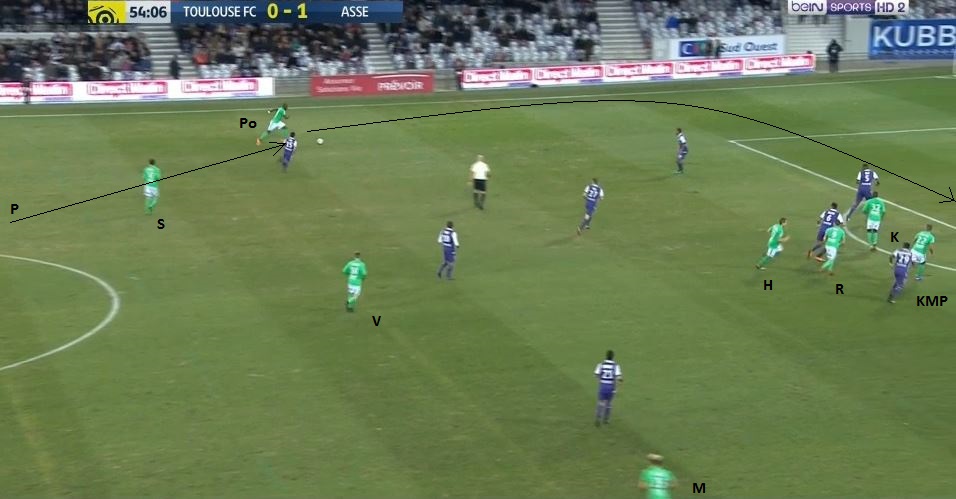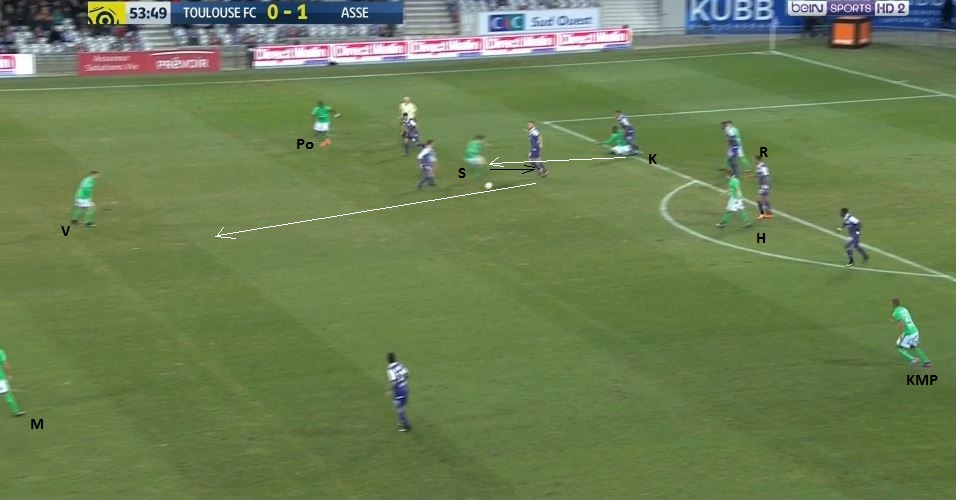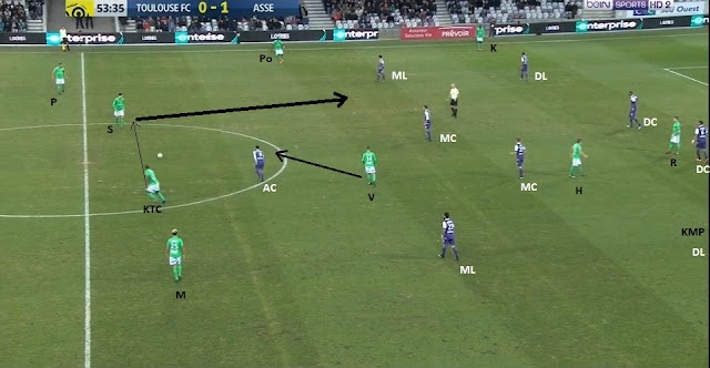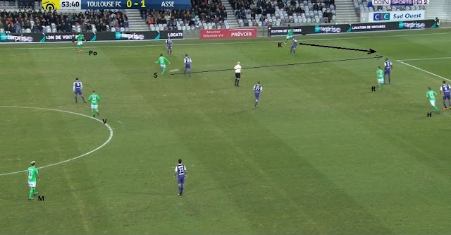 La tactique toulousaine en première période a été construite à base de trois éléments : un "10" bien placé entre les lignes, une relance propre avec des passes entre les défenseurs et les milieux (pas des longs ballons) et un bloc très haut quand les Violets n'avaient pas le ballon. La tactique stéphanoise a été une réponse adaptée aux deux derniers éléments, sans trop se soucier du premier : on a choisi de défendre en 4-4-2 sans suivre spécialement le "10" adverse. Ainsi, les attaquants des Verts ont fait un pressing très haut qui a poussé les défenseurs adverses à commettre des erreurs (chose soulignée par Galtier en conférence de presse après le match). Et surtout, les Stéphanois ont essayé des longs ballons dans le dos de la défense, tout en étant présents sur les deuxièmes ballons en cas de dégagement adverse, comme dans l'exemple suivant.