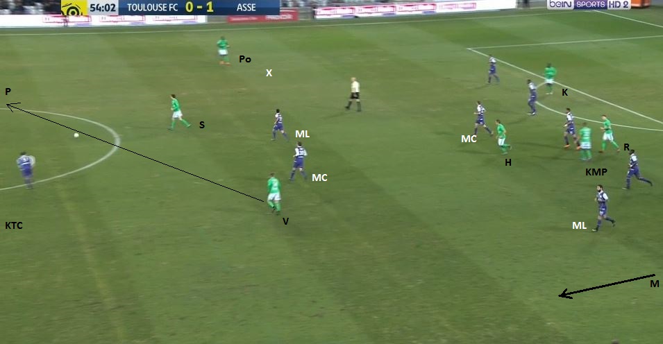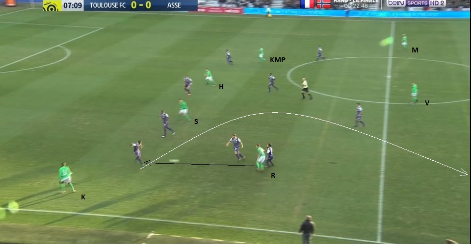 Lors des 6 premières minutes, pas moins de 3 fois les attaquants stéphanois ont été hors-jeu très près de la ligne médiane, tellement les Toulousains se positionnaient haut. Après ce troisième hors-jeu, le ballon est envoyé vers le 10 - Trejo - positionné entre les lignes :