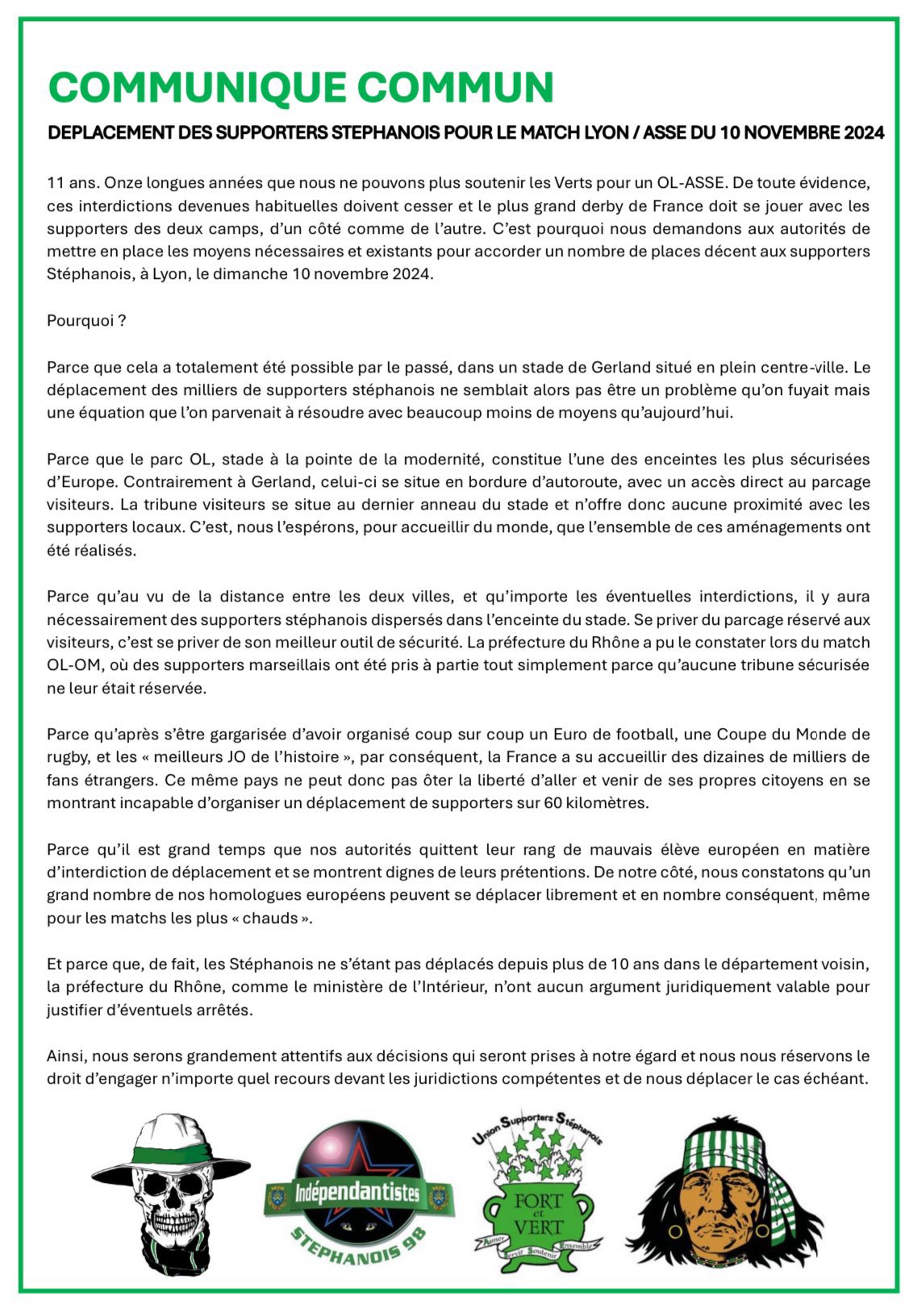 "Les supporters stéphanois demandent à faire le déplacement. Pour moi, c’est nécessaire qu'ils soient là. Et j’aimerais aussi beaucoup que nos supporters puissent assister au match là-bas. On a attendu des années, et aujourd’hui on va dire qu’on n’a pas le droit d’y participer ? Donc à partir du moment où on accepte, il faut assumer le fait qu’on accepte, et charge à chacun de reconnaître le droit qu’on leur donne et d’avoir le comportement adéquat. Alors oui, il faut qu’ils soient présents, mais que tout le monde se tienne bien."